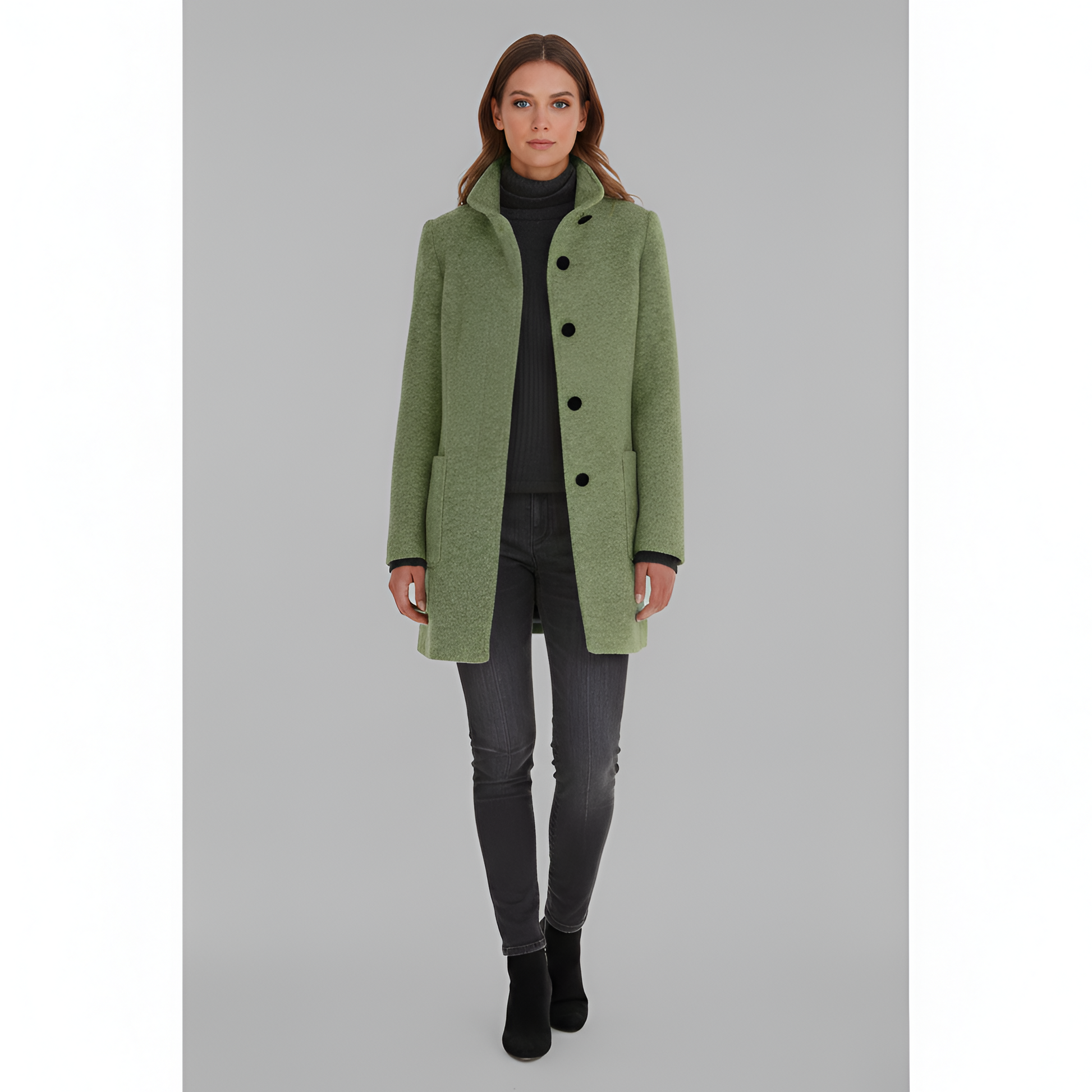 This women's wool blend coat offers warmth and lightness, ensuring ideal comfort for the cold season without sacrificing a clean and modern style. The design with a front button closure and high collar protects against the wind, while the regular fit allows for easy wear over sweaters and winter clothing. The patch pockets add practicality for everyday use, making the garment suitable for both urban settings and more elegant looks. A versatile model designed to combine functionality and simplicity.